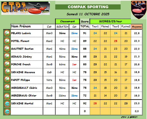 Les premiers tireurs du CTPA sont bien placés : Ludovic PELARD, premier tireur CTPA, 3éme au scratch et 2éme de la catégorie Man3 avec 91/100. Il devance 3 autres tireurs du CTPA : Bastien GAUTRET (88/100) et Jérémy GIRAUD (85/100) et PORCHE Franck 1er en SenB avec83/100.