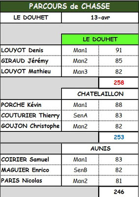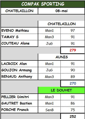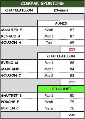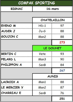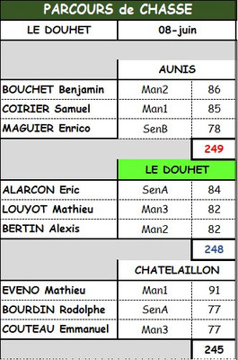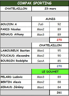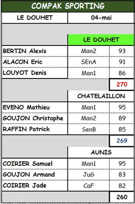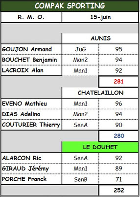 Le classement se fait en totalisant les meilleurs scores de 3 tireurs. Les tireurs doivent appartenir à des catégories différentes, ex : Man1, SenB, JuG.